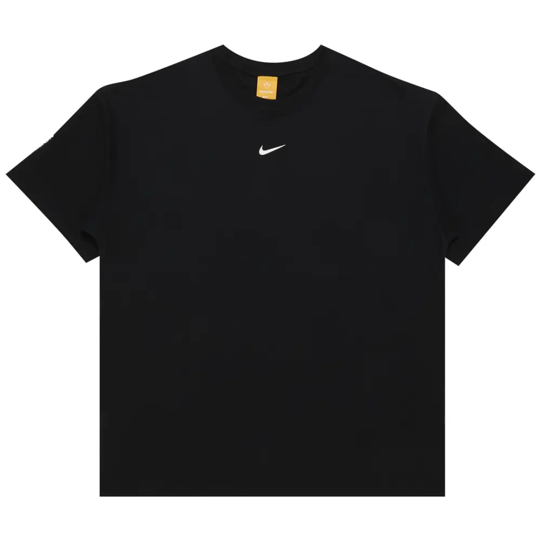 The Nike x NOCTA NRG Big Body CS Tee Black is a cotton t-shirt featuring white screen printed designs. The front features a small Nike Swoosh logo and NOCTA printed on the right sleeve. The back of the shirt is decorated with the NOCTA logo in large print and its three arrow icon, along with small text reading "C.L." and "A.W.R."